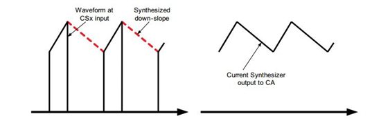 这里需要提到的一点,就是两个电流采样的CT都是放置在MOSFET的漏极上面的,理论上UCC28070只能采样到PFC电感一半的电流波形。但是UCC28070真的很强大,可以实现电感电流下降沿的合成,其大致的原理是:芯片内部有少量的电容,开通时,电流互感器检测的采样信号CSA及CSB加到电容上面,因为电容较小,CSA及CSB没有影响;关断时,流过合成电阻上面的电流给电容放电,模拟电容下降沿,如下图所示: