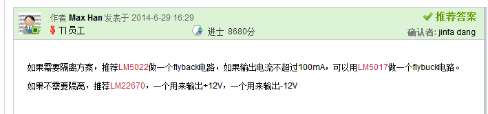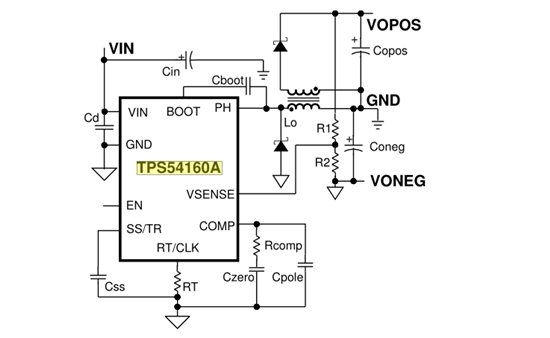 在看到这个帖子的时候,作为一个回答问的人来说,我也是不会到怎样回答,因为没有具体的描述出是多大功率范围的,一般我们根据功率的大小来进行对拓扑的选择,这个也不是唯一的方法,只不过一般是这样的,对于多路输出,有很多的方案可供选择,有隔离的和非隔离的,一般对于这种,用反激变换器就可以解决。这个是帖子的链接:http://www.deyisupport.com/question_answer/analog/power_management/f/24/t/64961.aspx,在这个帖子中,热新的TI FAE: Kevin Chen1 、 Frank 1 、Max Han都给出了耐心的解答,在此值得感谢。其中 工程师Kevin Chen1给出的方案是用电源管理芯片TPS54160A来设计的,电路图如下所示: