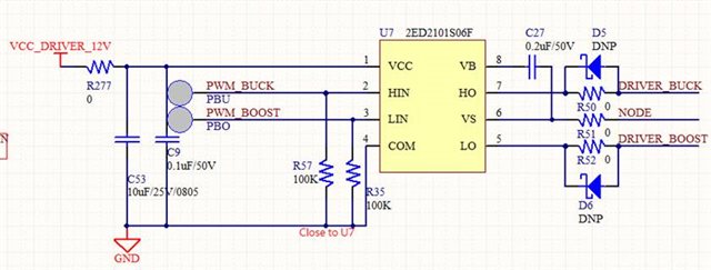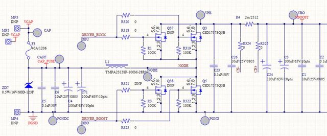 - 目前傾向往切換損失的方向驗證, 是否是該Driver推動電流或是斜率不匹配造成, 是否有建議修改的方向? Rg(R50, R52), Rgs(R1, R319), Cboot(C27), Rnode(R51)?