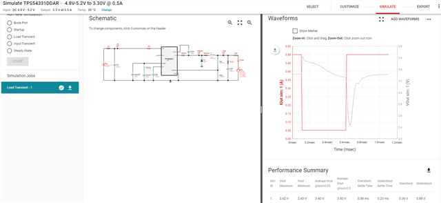 仿真时电源3.62V~2.43 V范围输出,动态响应太差了,0.5A的电流就掉了1V左右,