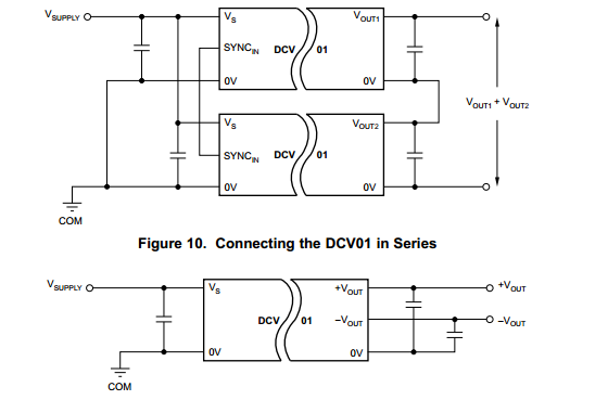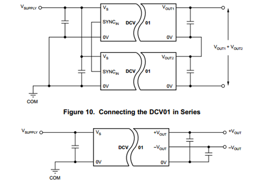 连接DCV01系列中,多个DCV01分离1W的dc-dc转换器可以串联,以提供非标准电压轨相连。这可以通过使用由该DCV01的电隔离提供的浮动输出。正VOUT连接从一个DCV01到负VOUT(0V)的另一个。如果在SYNCIN引脚被连接在一起,该DCV01的自同步功能将防止对差频电压轨。该DCV01的SYNCIN功能时不需要外接滤波容易串联连接,从而降低成本。在双输出的输出DCV01版本也可以串联连接,以提供两个倍的VOUT的大小。例如,一个双15-V的DCV01可以被连接到