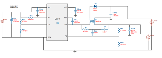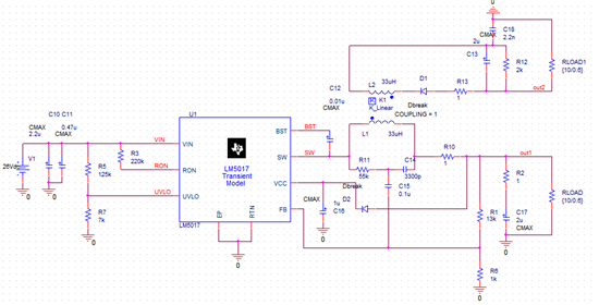 问题是这样描述的:目前想使用TI的LM5017设计电源,将27V左右的直流电压利用FLYBUCK转化为+-17V(由于后面想接LDO降噪,所以电压稍微大点,以便后面输出+-15V)。我一直根据AN-2292设置了相应的参数(下图一)。然后利用TI网站上下载的LM5017spice模型,在ORCAD中做仿真。但是利用瞬态仿真出来的结果却完全不对(图二)?而且经常跳出覆盖范围类的错误,请大师们指点,是否我的设置参数有问题,或则电路接的是错的?问题链接: