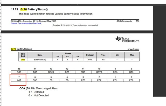 我们出现一个97%随机停充的问题,发现停充的时候的寄存器BattStatus 0X16的bit7出现了变化了,由0080变成00C0,由0变成1,看描述只是电量计初始化,但是这个触发的条件和功能是什么