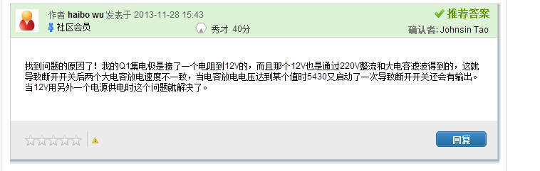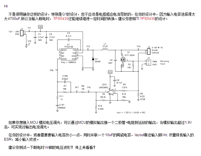 在这个帖子中,作者的疑问是:最近用TPS5430做了一个3A的恒流源,是用变压器输出整流18V供电,调节范围和负载调整率等指标都非常好,但实际使用时产品有烧坏现象。后来测了一下发现,断开总电源开关后会在5430输出端产生一个感应电流值。想请教下是不是我的layout的问题?其中解答问题的TI FAE 有: Johnsin Tao、 Kevin Chen1 。此帖子的链接为:http://www.deyisupport.com/question_answer/analog/power_management/f/24/t/49271.aspx
