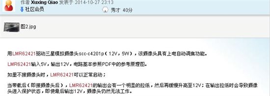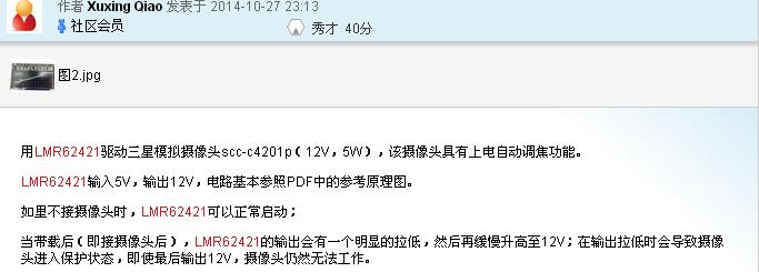 楼主Xuxing Qiao的主要问题如下:用LMR62421驱动三星模拟摄像头scc-c4201p(12V,5W),该摄像头具有上电自动调焦功能。LMR62421输入5V,输出12V,电路基本参照PDF中的参考原理图。如里不接摄像头时,LMR62421可以正常启动;当带载后(即接摄像头后),LMR62421的输出会有一个明显的拉低,然后再缓慢升高至12V;在输出拉低时会导致摄像头进入保护状态,即使最后输出12V,摄像头仍然无法工作。请问,这种情况下有什么解决办法,可以正常驱动摄像头?帖子链接: