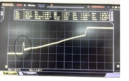 从上图中,我们基本上就了解了LMR62421的基本结构,以及升压控制原理,下面我们来看看楼主的电源的上电时候的波形,具体分析下导致这种情况的原因所在,如下图所示: