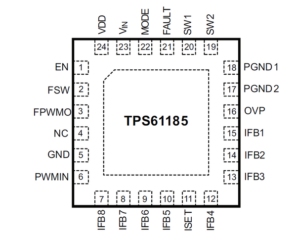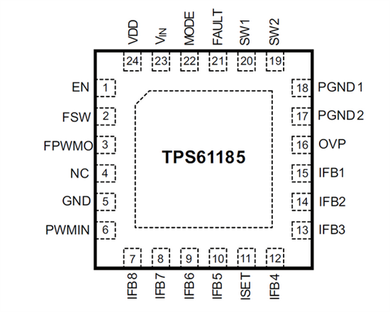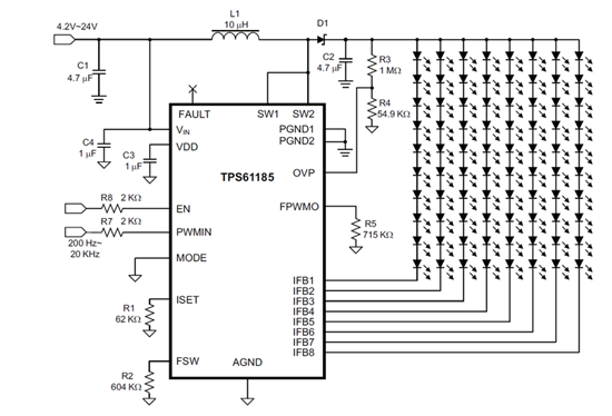 该TPS61185 IC提供了大尺寸LCD背光源高度集成的解决方案。该器件具有集成2 A /40 V功率MOSFET内置高效升压稳压器。这八个电流源稳压器提供高精度的电流调节和匹配。总体而言,设备可以支持高达80的LED。此外,该升压输出自动调整其电压到WLED正向电压,以提高效率。