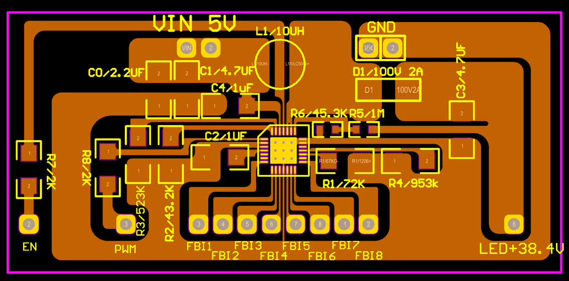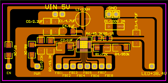 EN的铜箔不要延伸的电感之下, R5/R6的铜箔也不需要走在电容C3之下,直接从C3上面连接就可以了。