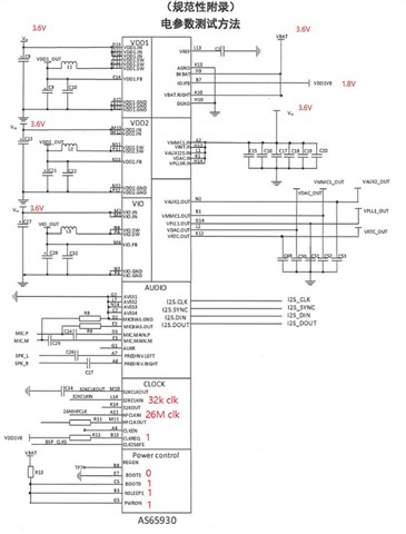 给vbat引脚3.6V电压,给模块各部分输入电压,延迟10ms,根据需要给控制引脚正确的电压,向时钟引脚输入32KHz时钟和26MHz时钟后,DC-DC和LDO部分输出电压异常。以下是我们的测试电路图和控制引脚电平图。 请问是什么原因?