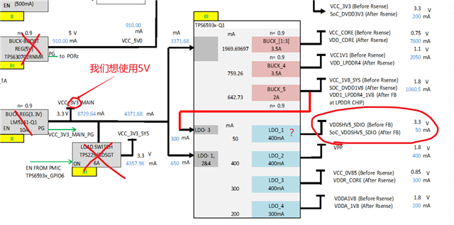 但是我们有和demo板不一样的地方在于:demo板的TPS6593供电输入是3.3V。 我们想使用TPS6593的输入是5V: