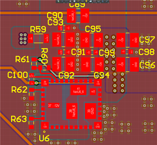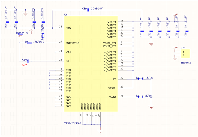 使用TPS84259设计了三路负电源,24V输出,-12V、-5V和-3.3V。
