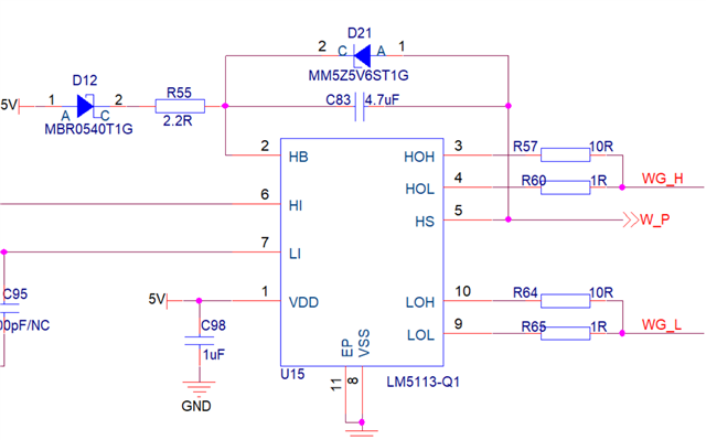 我们在测试LM5113-Q1的驱动电路时,发现上桥的驱动电压会随着输出电流的大小变化,当输出电流较大时会抬高不少,麻烦看下是什么原因,谢谢。