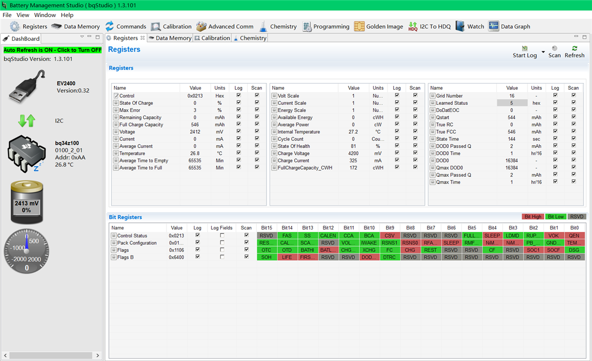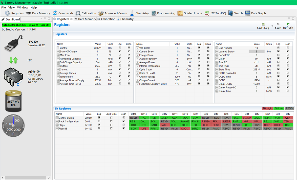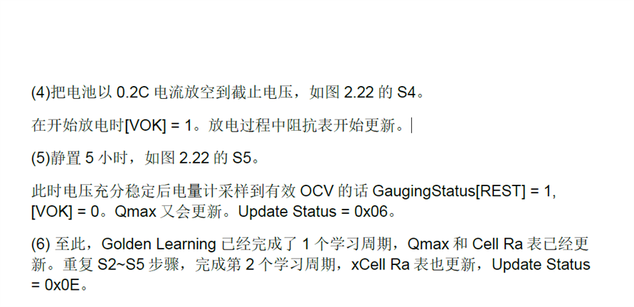 您好,数据手册介绍4. When discharging starts, ensure that the VOK bit is set. The gauge has the data flash parameter Dsg Threshold that determines the minimum current needed to enter the DISCHARGE state. If it discharges with less than this current, the VOK bit will not be set. The gauge will never go into the DISCHARGE state, and the Ra tables will never be updated. Update Status will be 05. Either decrease Dsg Threshold in the data flash, or increase the discharge rate.
