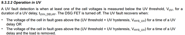 • The voltage of the cell in fault goes above the (UV threshold + UV hysteresis, VHYS_UV) for a time of a UV delay and the load is removed.