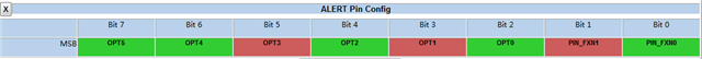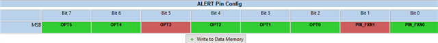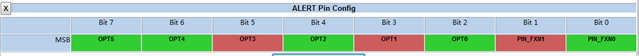 您有一个可上拉至3.3V 的外部上拉电阻器,猜测您是要将 ALERT 引脚配置为开漏输出。 请尝试将 ALERT 引脚配置更改为0b00100010并重试。