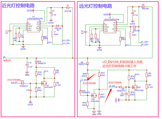 HI_EN接负极控制远光灯 亮灭,同时受控于LO_EN是否接入负极,如果LO_EN没有接入负极,则远光灯 不工作,LO_EN与HI_EN 同时接入负极 远光灯才能工作。