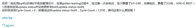 您好!我在用bq40z80做6节电池管理芯片,在做golden leaning过程中,经过第一次放电后,至少静置了5个小时,充满电后,静置了2小时,VOK=0, REST = 1,但是我发现updata status并没有更新到0x05,updata status=0x04;