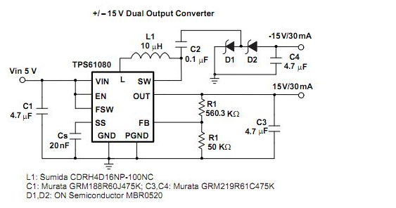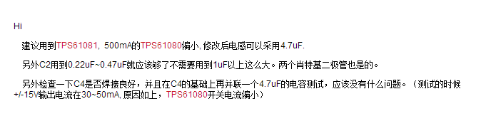 在这个帖子中,作者的疑问为:设计要求是用usb的5V转为+/-15V 70mA给运放供电。二极管用ss110代替,电感是在实验室找的,具体型号不清楚,应该是CD54系列的(标定电流1.44A 没有达到datasheet上要求的1.5A),4.7uF电容是钽电容。在空载时正电压接近15V,负电压接近-16V。挂负载(电阻)时,正电压输出正常,而负电压则降到了-5V以下,且随阻值减小而继续降低。