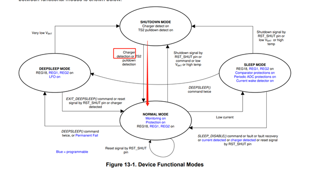 如手册中上图所示SHUTDOWN模式可通过Charger detect进入NORMAL模式,但是在软件知道和手册中都没有找到Charger detect相关说明。想了解一下这个功能具体怎么去实现。