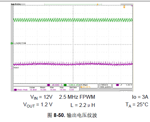 但是在手册下面找到一张图,FPWM mode,输入12V,输出1.2V,频率2.5MHz。根据计算Ton为40ns,小于上图标注的50ns。该应用是否存在风险?