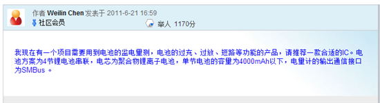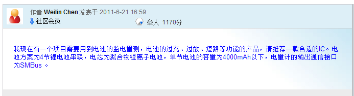 具体问题:社区会员Weilin Chen在2011年6月21日,在电源管理板块针对TI的充电管理芯片方案向TI相关技术人员提出了求帮助的请求,我现在有一个项目需要用到电池的监电量测,电池的过充、过放、短路等功能的产品,请推荐一款合适的IC。电池方案为4节锂电池串联,电芯为聚合物锂离子电池,单节电池的容量为4000mAh以下,电量计的输出通信接口为SMBus 。