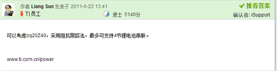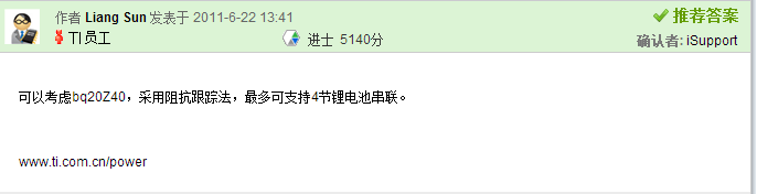 从这个案子中我学到的东西:从这个案子中我根据相关的芯片,在TI的官方网站上找到了相关的资料,在这里具有 Impedance Track 技术的符合 SBS 的电量监测计,适用于与 BQ29330 共同使用BQ20Z40(www.ti.com.cn/.../bq20z40 guide,通过自己的研究发现德州仪器 (TI) BQ20Z40是一款非常优秀的电源管理芯片,在具体应用中,Liang Sun 根据项目的具体情况 有一个项目需要用到电池的监电量测,电池的过充、过放、短路等功能的产品,请推荐一款合适的IC。电池方案为4节锂电池串联,电芯为聚合物锂离子电池,单节电池的容量为4000mAh以下,电量计的输出通信接口为SMBus。向Weilin Chen 提出了相关的方案,可以考虑bq20Z40,采用阻抗跟踪法,最多可支持4节锂电池串联。