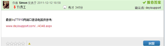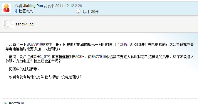 社区会员JiaNing Pan在2011年12月12日,在电池管理板块针对TI的充电管理芯片BQ77910提出了相关的疑问,  我看了一下BQ77910的技术手册,所提供的电路图都无一例外的使用了CHG_ST引脚进行充电的检测,这会导致充电器与电池连接时需要多加一根检测线。