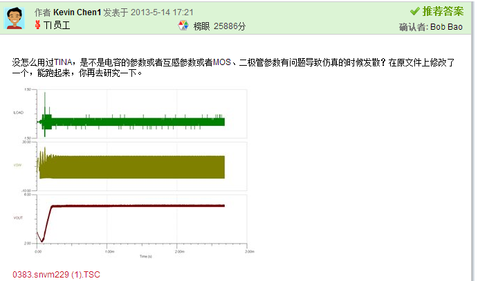 具体问题:社区会员Bob Bao在2013年5月13日,在电源管理板块针对TI的电源管理芯片LM3481提出了相关的疑问,请问按照LM3481手册提供的典型应用在TINA-TI中进行仿真,仿真结果与手册完全不同。。。