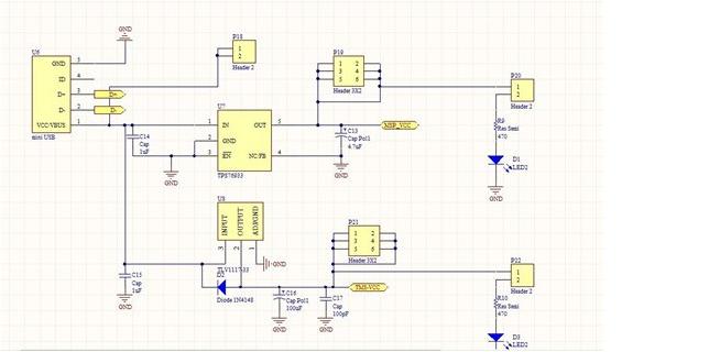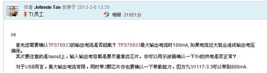 TI FAE:Johnsin Tao也指出了另外的一种可能性,如下图所示:首先您需要确认TPS76933的输出电流是否超载? TPS76933最大输出电流时100mA, 如果电流过大就会造成输出电压偏低。其次要注意的是layout上,输入输出电容都是要尽量靠近芯片。你可以用示波器确认一下5V的供电是否正常?对于USB而言,最大输出电流有限,同时带2颗芯片你也要确认一下带载能力,因为TLV1117-3.3可以带到800mA.