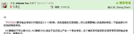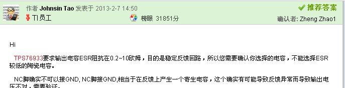 Johnsin Tao也对电容的问题作出了补充,我们一起看看: TPS76933要求输出电容ESR阻抗在0.2~10欧姆,目的是稳定反馈回路,所以您需要确认你选择的电容,不能选择ESR较低的陶瓷电容。 NC脚确实不可以接GND, NC脚接GND,相当于在反馈上产生一个寄生电容,这个确实有可能导致反馈异常而导致输出电压不对,需要验证。