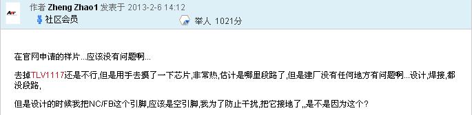 对于这个问题,楼主也做出了澄清:官网申请的样片...应该没有问题啊...去掉TLV1117还是不行,但是用手去摸了一下芯片,非常热,估计是哪里段路了,但是建厂没有任何地方有问题啊...设计,焊接,都没段路,但是设计的时候我把NC/FB这个引脚,应该是空引脚,我为了防止干扰,把它接地了,,是不是因为这个?