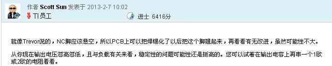 TI 的FAE : Scott Sun 给出了最终的答案:就像Trevor说的,NC脚应该悬空,所以PCB上可以把焊锡化了以后把这个脚翘起来,再看看有无改进,虽然可能性不大。从你现在输出电压忽高忽低,且与负载有关来看,稳定性的问题可能性还是挺高的。您可以试着在输出电容上再串一个1欧或2欧的电阻看看。
