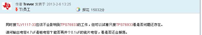 TI FAE: Trevor,Scott Sun解答了楼主的问题:同时接TLV1117-33应该不会影响到TPS76933的工作,但可以试着只接TPS76933看是否问题还存在。