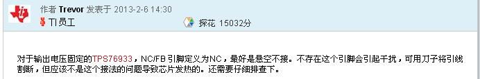 TI 的FAE对于这个问题也做出了解答:对于输出电压固定的TPS76933,NC/FB 引脚定义为NC,最好是悬空不接。不存在这个引脚会引起干扰,可用刀子将引线割断,但应该不是这个接法的问题导致芯片发热的。还需要仔细排查下。
