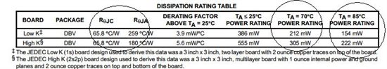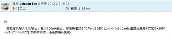 TI的FAE:Johnsin Tao还从热阻的方面对问题做出了分析:按照你5V输入3.3V输出,最大100mA输出,即便热阻259 °C/W( JEDEC Low K (1s) board), 温度也就是70℃[25+259*(5-3.3)*0.1=,70℃] 如果非常烫,还是要确认负载。
