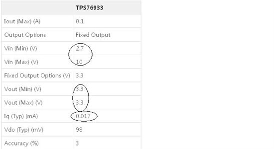 如上图所示,我们可以看到TPS76933的最大输入电压可以达到10V。输出的典型电压为3.3V,准确率为3%以内,相当的不错了,这个对我们的设计就简单多了.