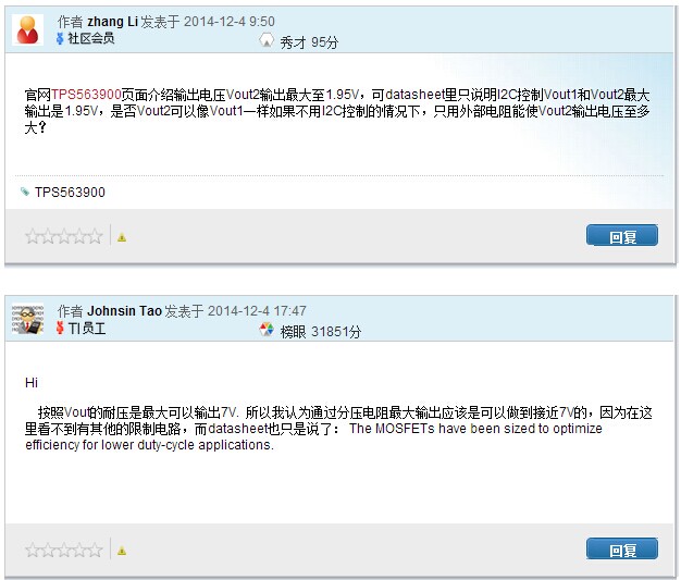 近来因为有个案子,要用到I2C控制电压输出的这个功能,然后就在TI和TI社区上找找看有没有相似的例子或者问题。不经意间,在TI社区看到一个贴子,说关于TPS563900芯片具有这个功能,但使用者有点疑问。这些疑问正好解答我心中的疑虑。