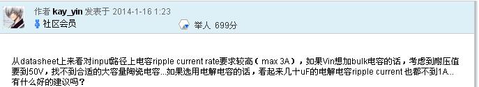 我们看看楼主的另外一个问题:从datasheet上来看对input路径上电容ripple current rate要求较高(max 3A),如果Vin想加bulk电容的话,考虑到耐压值要到50V,找不到合适的大容量陶瓷电容...如果选用电解电容的话,看起来几十uF的电解电容ripple current 也都不到1A...有什么好的建议吗?