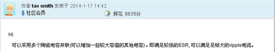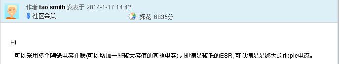 对于楼主的这个问题,网友做出了回答:   可以采用多个陶瓷电容并联(可以增加一些较大容值的其他电容),即满足较低的ESR, 可以满足足够大的ripple电流。如下图所示: