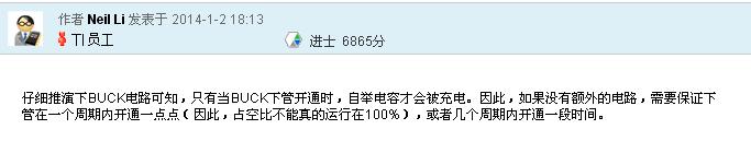对于这个问题,TI的技术人员是如何回答的呢?我们来学习一下:仔细推演下BUCK电路可知,只有当BUCK下管开通时,自举电容才会被充电。因此,如果没有额外的电路,需要保证下管在一个周期内开通一点点(因此,占空比不能真的运行在100%),或者几个周期内开通一段时间。