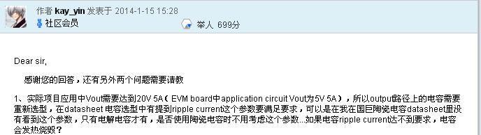 对于这个问题,楼主还有另外的一个疑问:还有另外两个问题需要请教1、实际项目应用中Vout需要达到20V 5A(EVM board中application circuit Vout为5V 5A),所以output路径上的电容需要重新选型,在datasheet 电容选型中有提到ripple current这个参数要满足要求,可以是在我在国巨陶瓷电容datasheet里没有看到这个参数,只有电解电容才有,是否使用陶瓷电容时不用考虑这个参数...如果电容ripple current达不到要求,电容会发热烧毁?2、用于调节Vout电压的feedback电阻如果使用RDAC数字电位计替代,实现电压可调,实际应用会存在什么风险吗(RDAC耐压值等参数满足要求)?