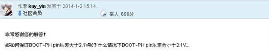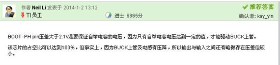 T I FAE:  解答了楼主的问题:BOOT -PH pin压差大于2.1V是要保证自举电容的电压,因为只有自举电容电压达到一定的值,才能驱动BUCK上管。