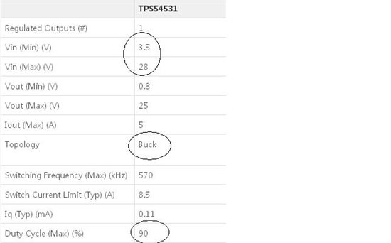 如上图所示,我们可以看到TPS54531 的输入电压范围为3.5V到28V输出电压范围为0.8V到25V。最大输出电流为5A,最大的占空比为90%,典型的控制拓扑结构为BUCK,也就是说TPS54531 只能实现降压输出。这个对我们的设计就简单多了.