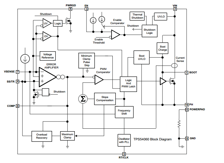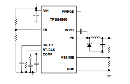 TPS54060器件是60V,0.5A降压稳压器具有集成高侧MOSFET。电流模式控制提供了简单的外部补偿和灵活的组件选择。低纹波脉冲跳跃模式降低到116μA的无负载稳压输出电源电流。使用使能引脚,关断电源电流降至1.3μA,当使能引脚为低电平。欠压锁定在内部设定为2.5V,但可使用的使能引脚增加。输出电压启动斜坡是由也可用于测序/跟踪配置的慢启动引脚控制。漏极开路电源良好信号指示输出电压为93%〜107%的额定电压