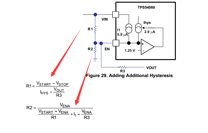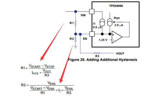 另一种技术来添加输入电压滞后如下图所示。该方法可以用于,如果电阻值是从以前的方法高和更宽电压滞后是必要的。电阻R3来源额外的滞后电流流入EN引脚。