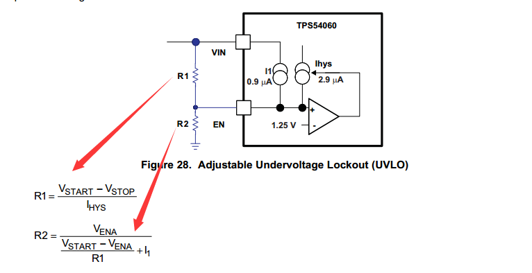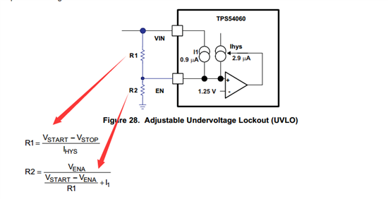 当VIN引脚电压低于2.5 V.如果应用程序需要更高的TPS54060被禁用欠压锁定(UVLO),使用EN引脚如下图所示通过调节输入电压UVLO两个外部电阻器。虽这不是必要使用UVLO调整寄存器,操作它是高度建议提供一致的电行为。 EN引脚具有一个内部上拉电流源,I1,0.9μA,提供了TPS54060工作时,EN引脚悬空的默认状态。一旦EN引脚电压超过1.25V,迟滞,Ihys额外2.9μA,被添加。这额外的电流输入方便电压滞后。使用等式2来设置外部滞后输入电压。用公式3设置输入电压启动。