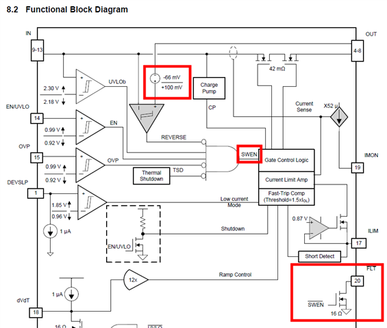 参考规格书的功能框图。当Vout-Vin>66mv时,NFLT脚会拉低,芯片也会去关断。