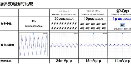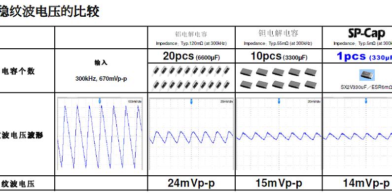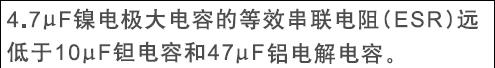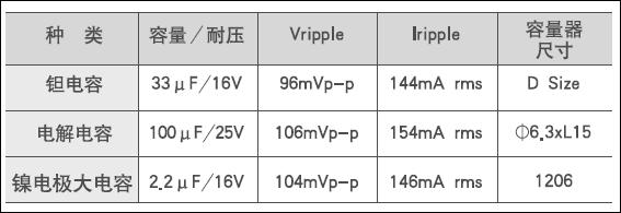 可以看出,按照该厂家的资料介绍,可以选用低耐压、小容量和小封装的镍电容来替代大容量的铝电解电容,达到相同滤波效果。