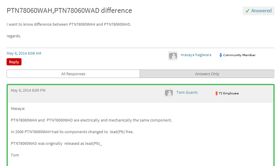 关于作者的疑问,TI FAE的解答如下:”你好,首先这两款电源模块在电气性能和机械尺寸上都是完全一样的,任意选其中一款都可以。两者的区别只是产品开发的历史中, PTN78060WAH 是在2006年将含铅的材料全部替换为无铅材料,所以它是从有铅的材料改过来的。而 PTN78060WAD是从一开始就采用的无铅材料。这个后缀D和H的不同只是为了标记升级为无铅产品的历史记录。谢谢!“
