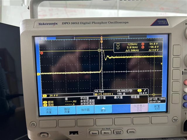 从示波器看36V电压冲到55V了。但是还没有达到芯片的极限。